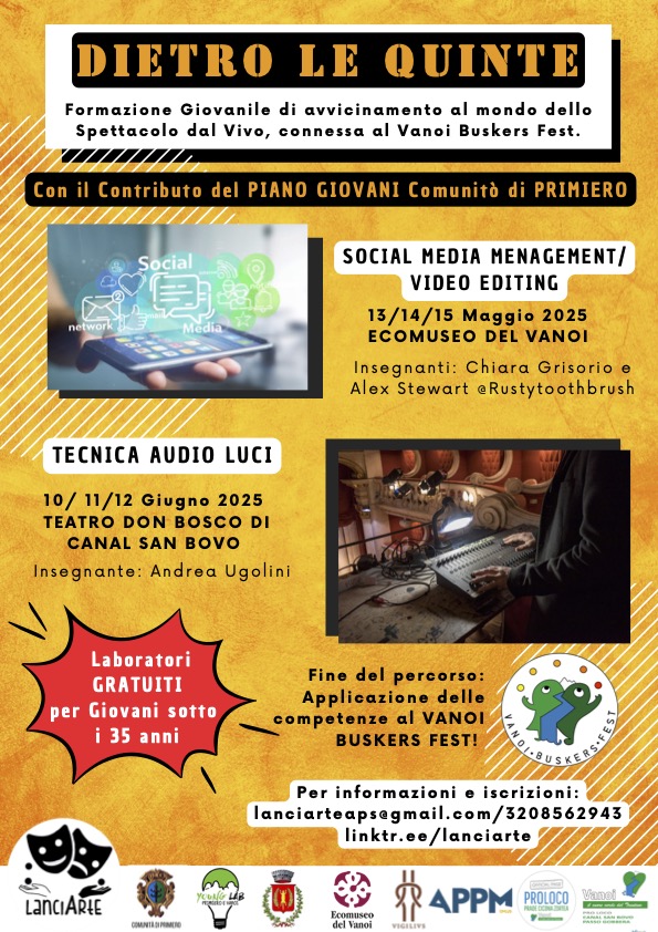 Siamo lieti di annunciare che il progetto di Formazione Dietro le Quinte, progetto di Formazione giovanile gratuito e connesso al VANOI BUSKERS FEST ha ottenuto il contributo del PSG PIANO GIOVANI PRIMIERO VANOI … Grazie infinite @younglabprimierovanoi e Comunità di Primiero!!!!